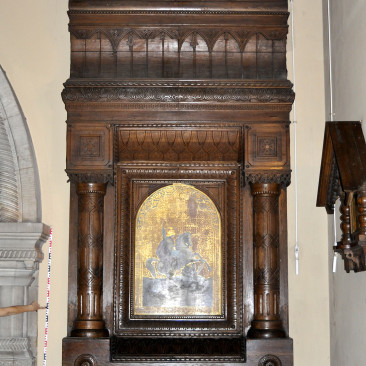 Die Kirche wurde von 1912 bis 1913 erbaut und dient dem Gedenken an die zweiundzwanzigtausend russischen Soldaten, die während der Völkerschlacht 1813 bei Leipzig gefallen sind. Der Kiot (Ikonenrahmen) gehört zur ursprünglichen Ausstattung. Er besteht aus mehreren vertikal zusammengesetzten Elementen. Während des Abbaus wurde er zerlegt. Die Restaurierung erfolgte in der Werkstatt und beinhaltete die Reinigung, die Behebung der konstruktiven Schäden, Festigung loser und Ergänzung fehlender Furniere, sowie die Ergänzung fehlender Applikationen. Die aufliegende Beschichtung am Kiot stellte sich als Überarbeitung heraus. Aufgrund des degradierten Zustandes erfolgte eine Abnahme der vorhandenen und Auftrag einer neuen Beschichtung.